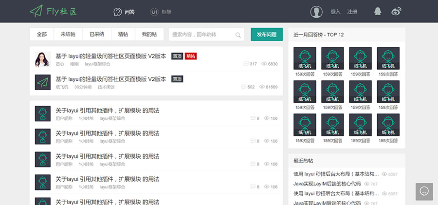 Fly Template 由 layui官方社区( Fly社区 ) 倾情抽取,基于 layui 搭建而成,提供了全屏和固宽两类排版,并且具备响应式适配能力,可很好地作为简约型问答社区的页面模版支撑 全屏风格 模版提供了全屏风格,你可以打开 html/full.html预览效果 使用全屏风格只需在原有css的基础上,引入 css/full.css即可
